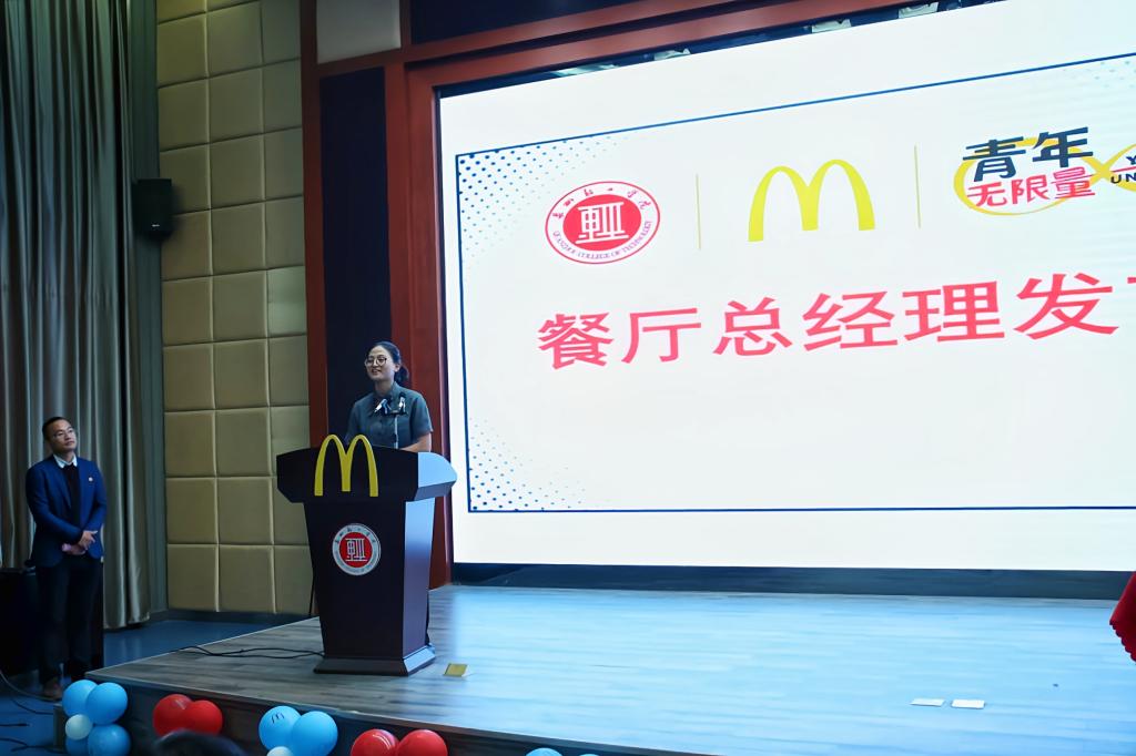 最后由麦当劳餐厅总经理代表赖锦燕女士发言,她感谢麦当劳这三年来对她的系统性培养,在麦当劳职业启航班的培养体系中,逐步地实现了从基础岗位--部门经理--人力资源部经理--餐厅总经理的完美蜕变,她诚邀现场所有准备步入实习阶段的同学加入麦当劳大家庭,实现自己年轻人的梦想,因为麦当劳始终相信最强的生命力来源于年轻人,我们就相信年轻人。